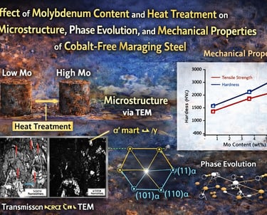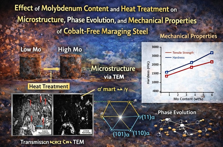 Effect of Molybdenum Content and Heat Treatment on Microstructure, Phase Evolution, and Mechanical Properties of Cobalt-Free Maraging Steel